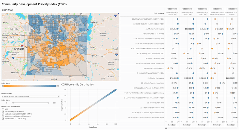 Our Community Development Priority Index (CDPI) brings 16 CRA-relevant indicators together to identify and compare gaps across your Assessment Area, from neighborhoods down to the census tract level.